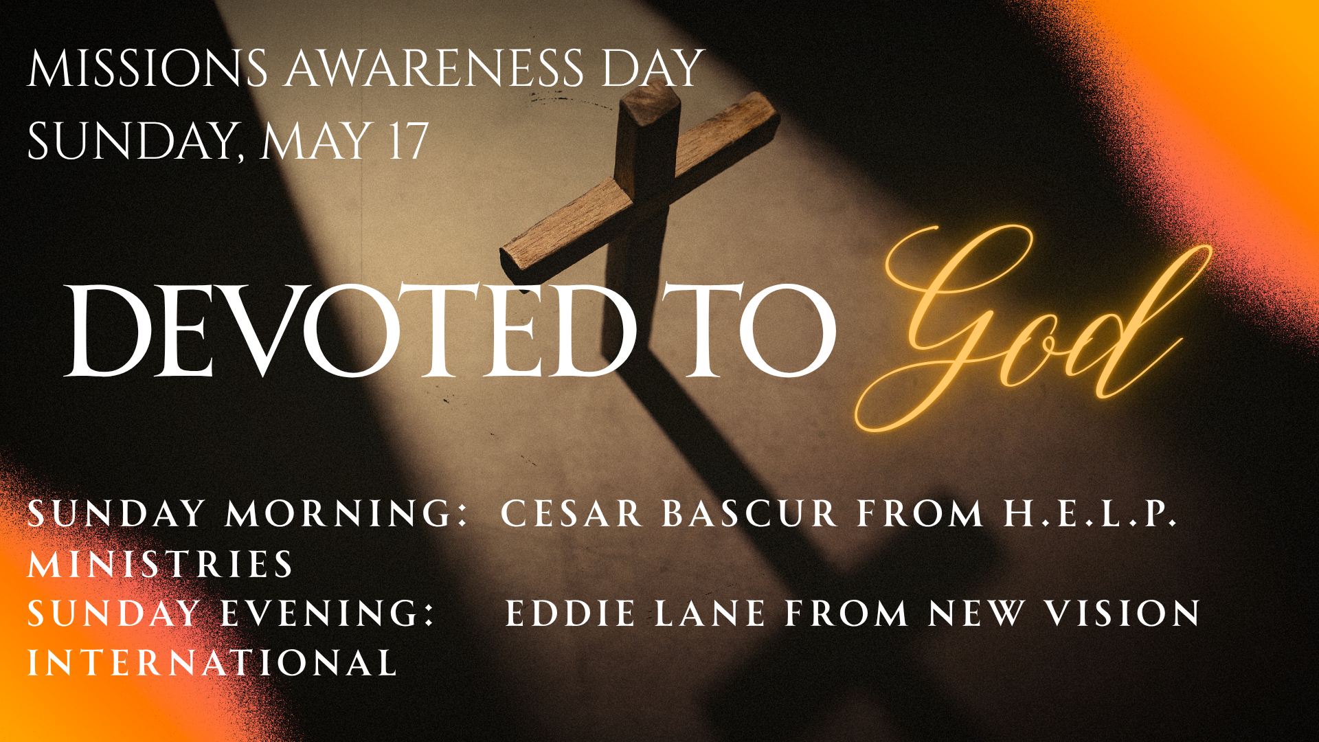 During the Sunday morning worship service at 10:45am, we will hear from Brother Cesar Bascur from H.E.L.P. Ministries in King, NC During the Sunday evening service at 6:00pm, we will hear from Brother Eddie Lane from New Vision International